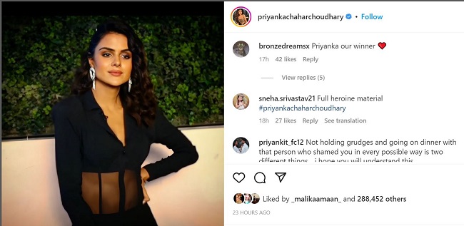 प्रियंका चाहर चौधरी की तस्वीरें इंस्टाग्राम पर वायरल हो गई है। इसे तीन लाख के करीब लाइक्स मिले हैं। वहीं, इस पर हजारों की संख्या में कमेंट किए गए हैं। एक ने लिखा है, ‘प्रियंका हमारी विनर है।’ एक ने लिखा है, ‘प्रियंका चौधरी पूरी हीरोइन मटेरियल है।’ वहीं, एक ने लिखा है, ‘एक ऐसे व्यक्ति के साथ डिनर डेट पर जाना, जिसने बिग बॉस के घर में आपको हमेशा नीचा दिखाने की कोशिश की। दो अलग चीजें हैं। मुझे लगता है आपके समझ रही है।’ एक ने लिखा है, ‘अगर आपने अपनी हार से कुछ सीखा है तो आप हारे नहीं हो।’ एक ने लिखा है, ‘बिग बॉस खत्म हो गया है लेकिन जलने वाले अभी खत्म नहीं हुए है।’