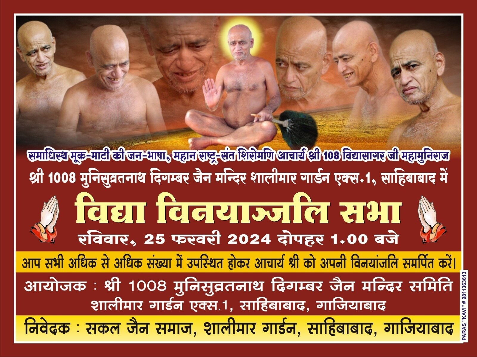 ग्वालियर अखिल जैन समाज ग्वालियर, भगवान महावीर जयंती महोत्सव समिति द्वारा आचार्य विद्यासागर महाराज को विनयांजलि, निःशुल्क स्वास्थ्य शिविर एवं सम्मान समारोह का आयोजन 25 फरवरी को किया जाएगा। श्री श्वेतांबर उपाश्रय बैरागपुरा सराफा बाजार में उक्त कार्यक्रम सुबह 10 बजे से होगा।